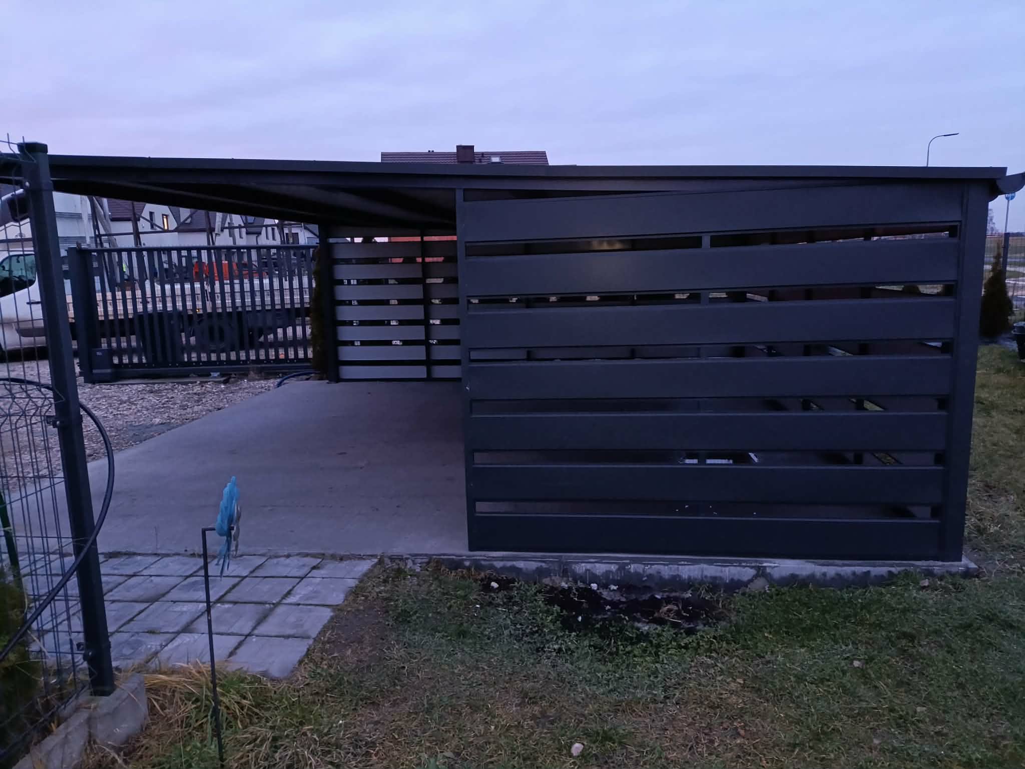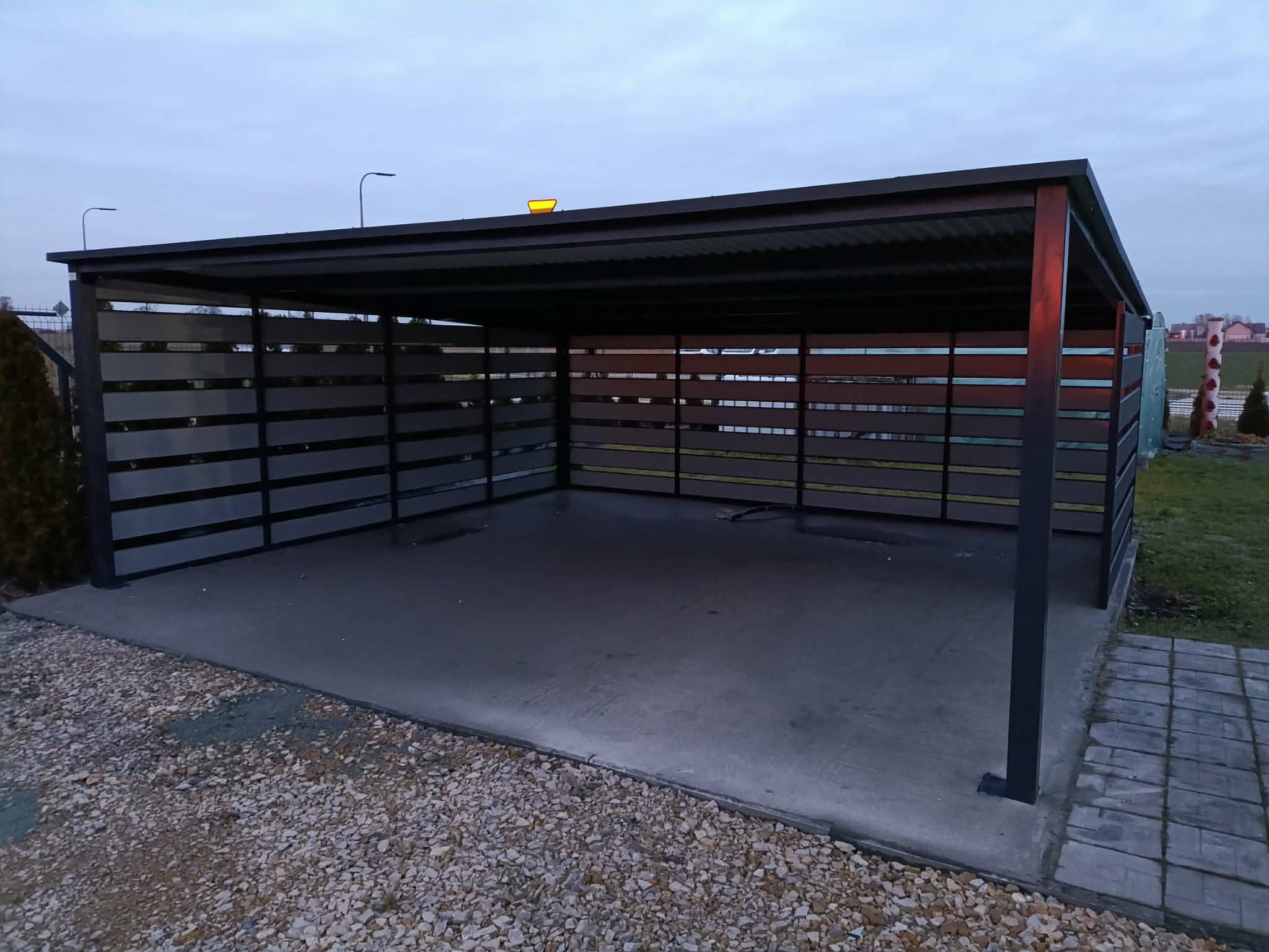 Ściany zabudowane lamelami kolor grafit- lewa ściana i tylna w całości, prawa strona na szerokości 2,5m od tylnej krawędzi