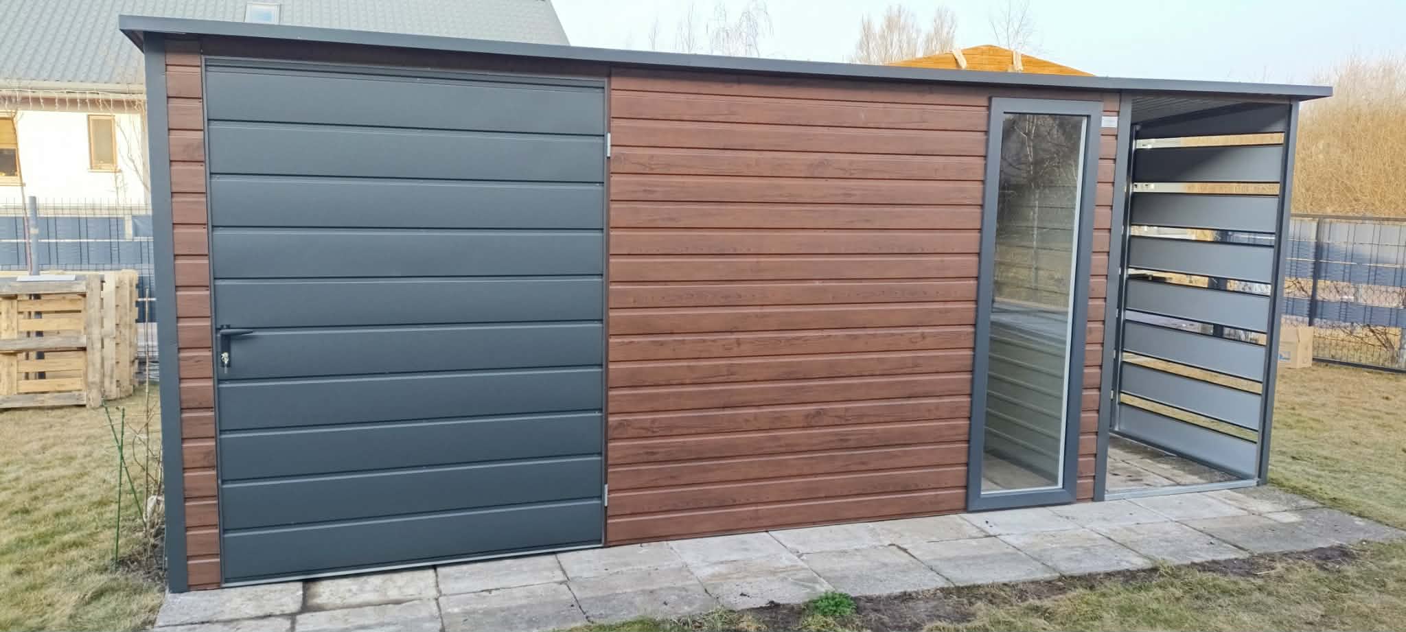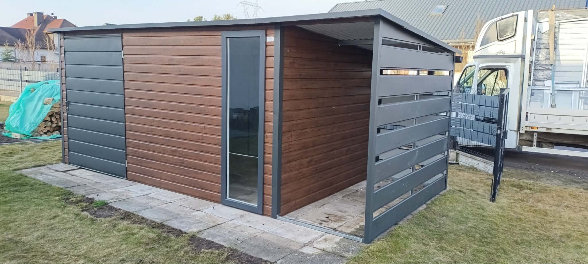 wiatka 1,10 x 2,50 umiejscowiona z prawej strony, tył i bok zabudowany lamelami kolor grafit